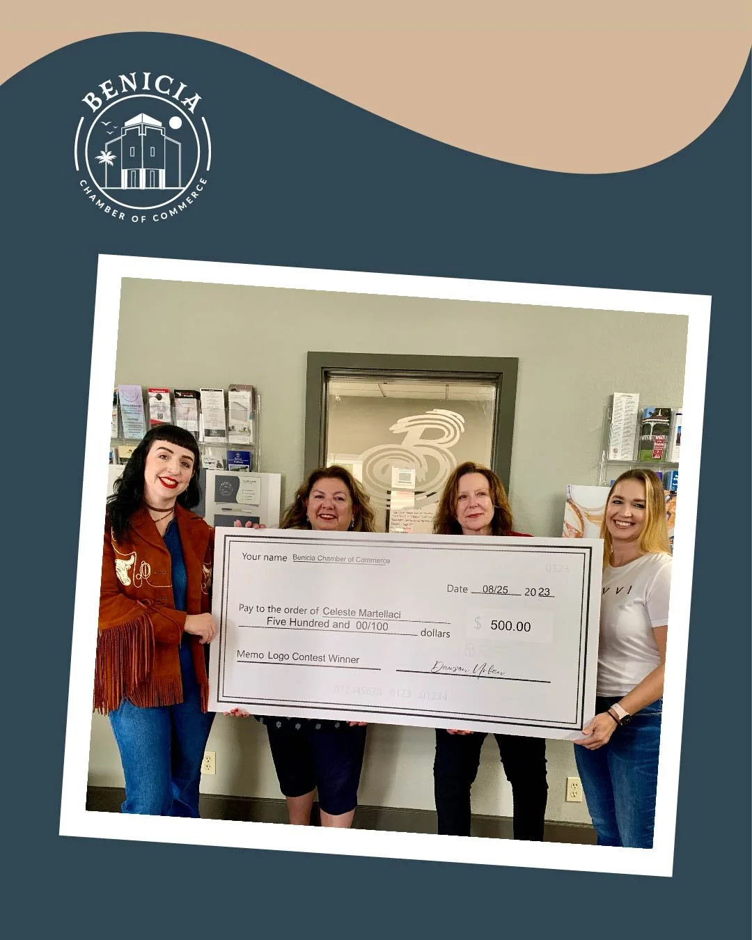 The Benicia Chamber of Commerce held a logo competition for their rebrand and in September of 2023 I was announced as the winner. I was honored with a giant check and was announced as the winner on the front page of the Benicia Herald newspaper.